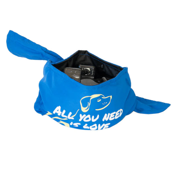 Bandana Bowl EASILY unfolds into a portable WATER BOWL! OR dip in the water - fill inside with ice, and Bandana doubles as a Cooling Collar!